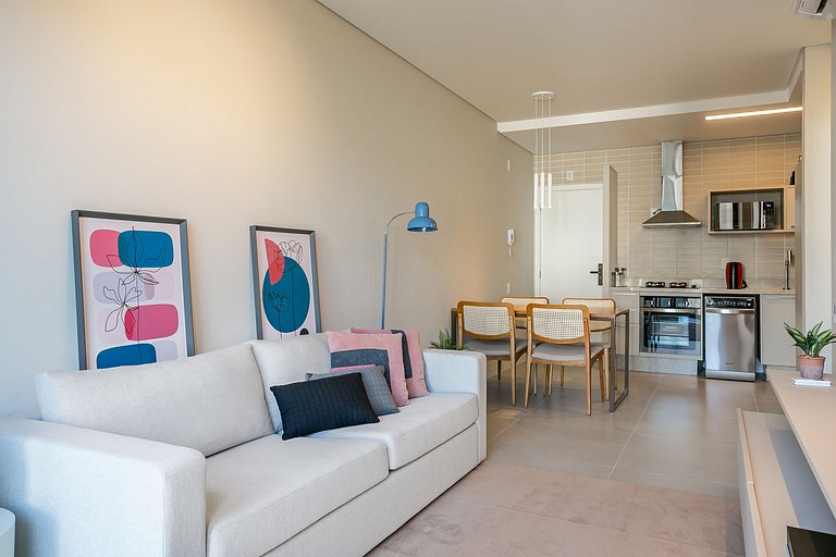 O imóvel de 62m² conta com um quarto com uma cama QUEEN e uma Smart TV de 32", uma sala de estar com Smart TV de 50" e uma varanda com vista ampla da cidade. Todos os cômodos possuem AC SPLIT (SÓ FRIO).