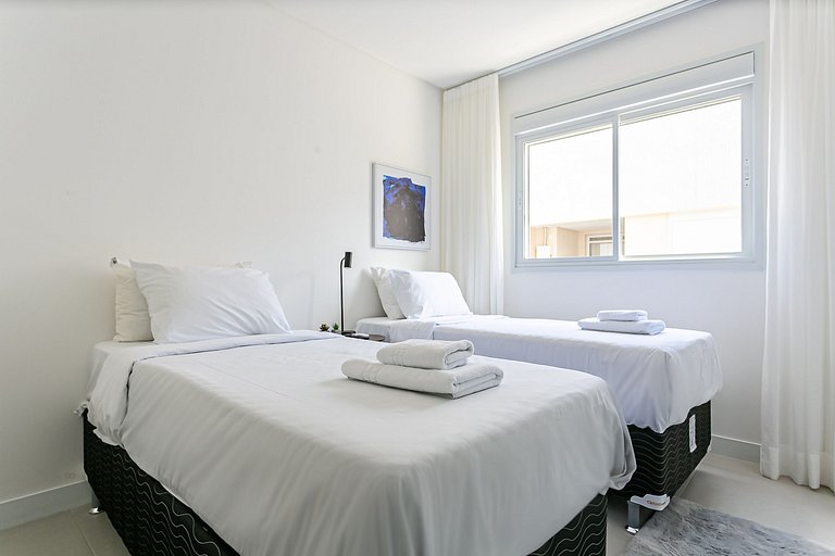 O imóvel de 84m² conta com uma suíte com uma cama de CASAL e Smart TV, um quarto com duas camas de SOLTEIRO e Smart TV, além de uma sala de estar com Smart TV. Ambos os quartos são equipados com Ar-condicionado SPLIT.