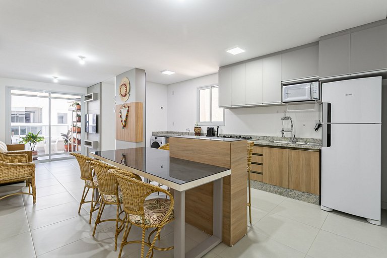- Cozinha completa com cafeteira, geladeira com congelador, liquidificador, máquina lava-louças, micro-ondas, sanduicheira, utensílios de cozinha e jogo de panelas