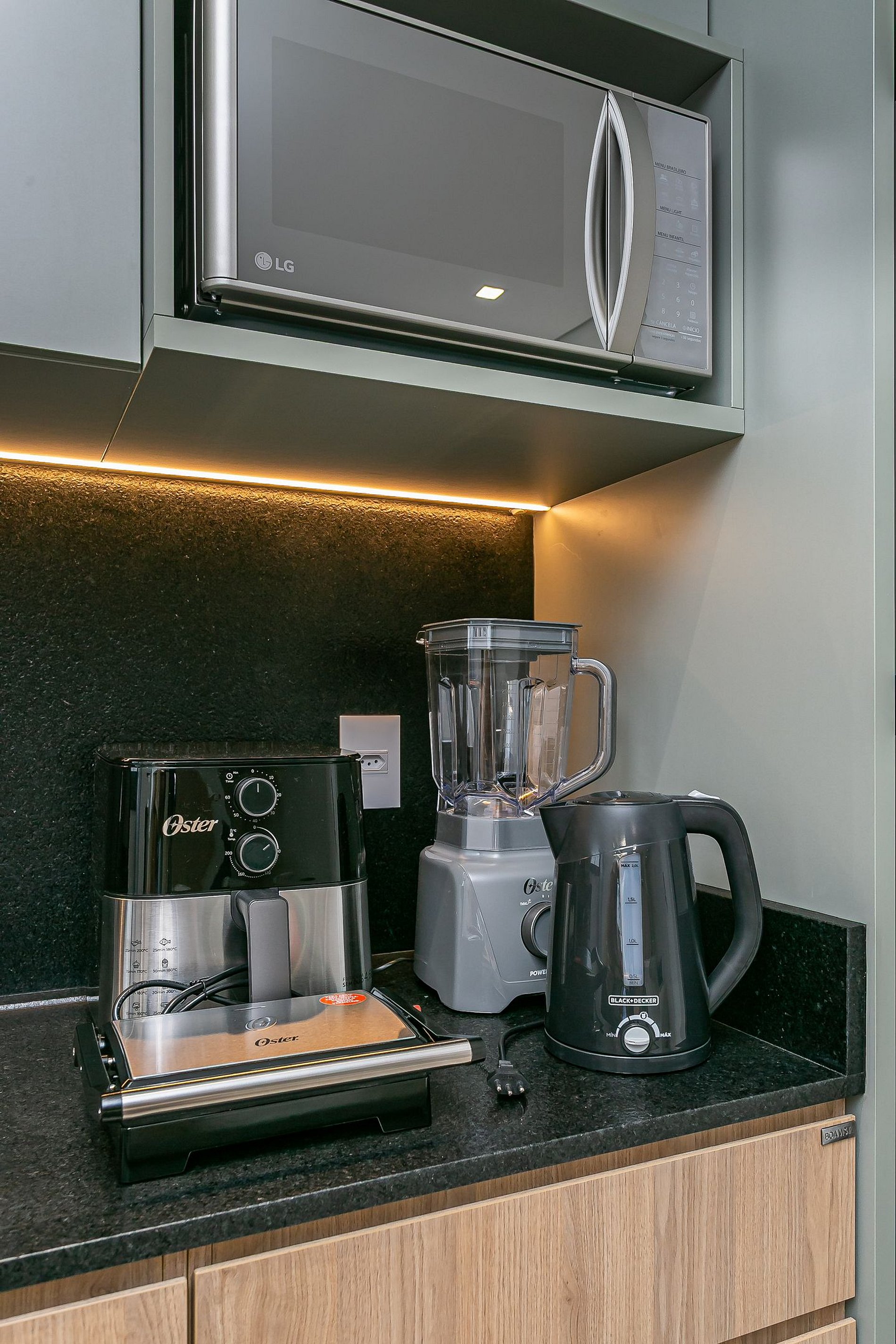 - Cozinha completa com cafeteira, geladeira com congelador, liquidificador, micro-ondas, sanduicheira, utensílios de cozinha e jogo de panelas