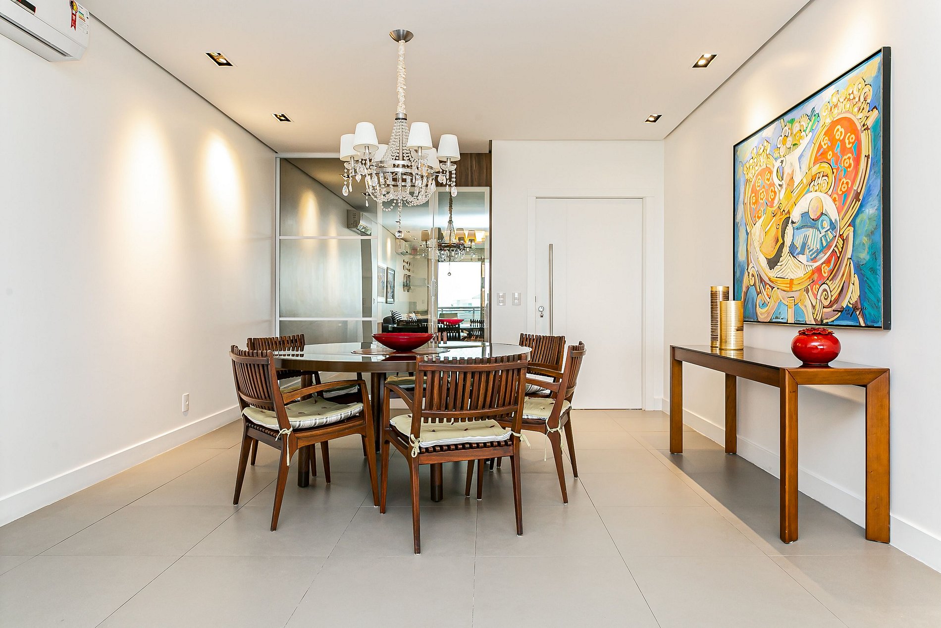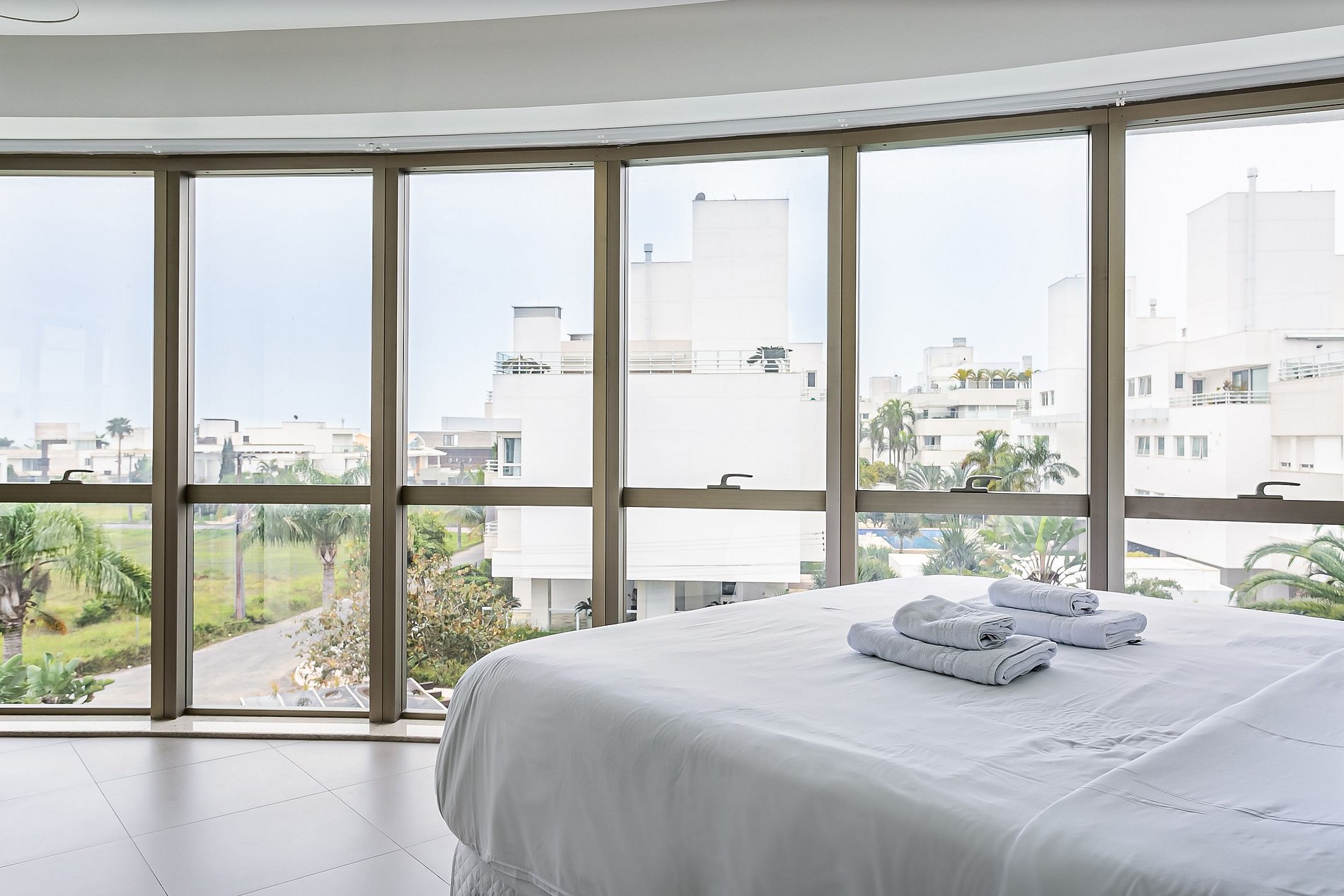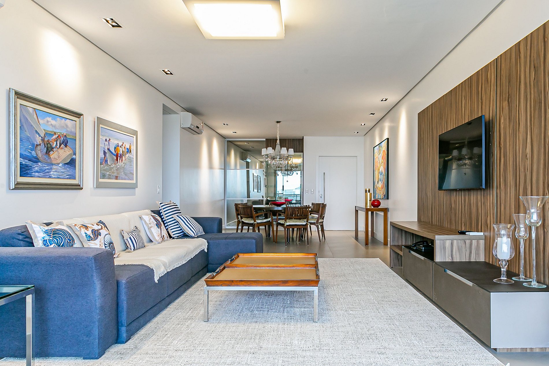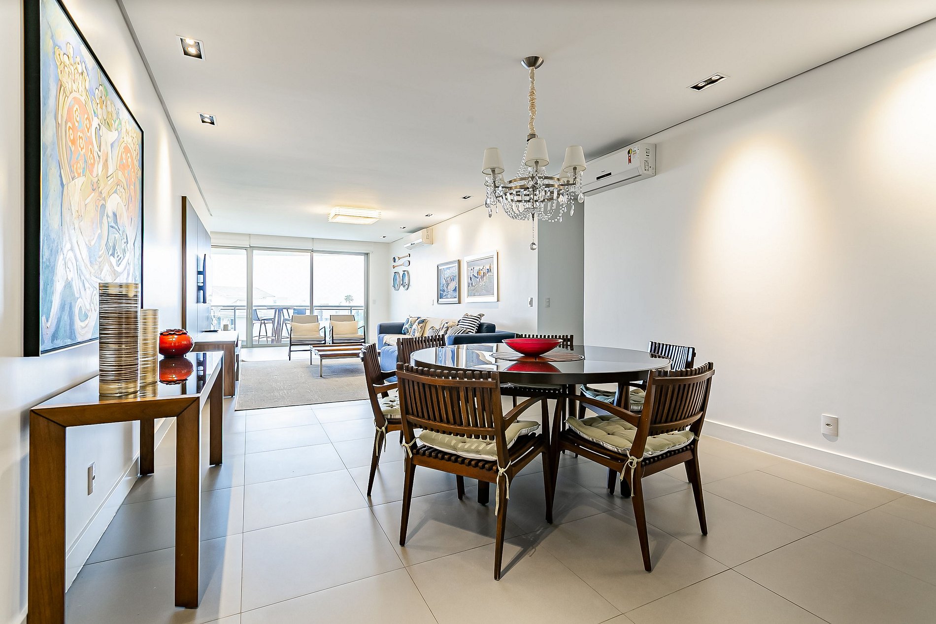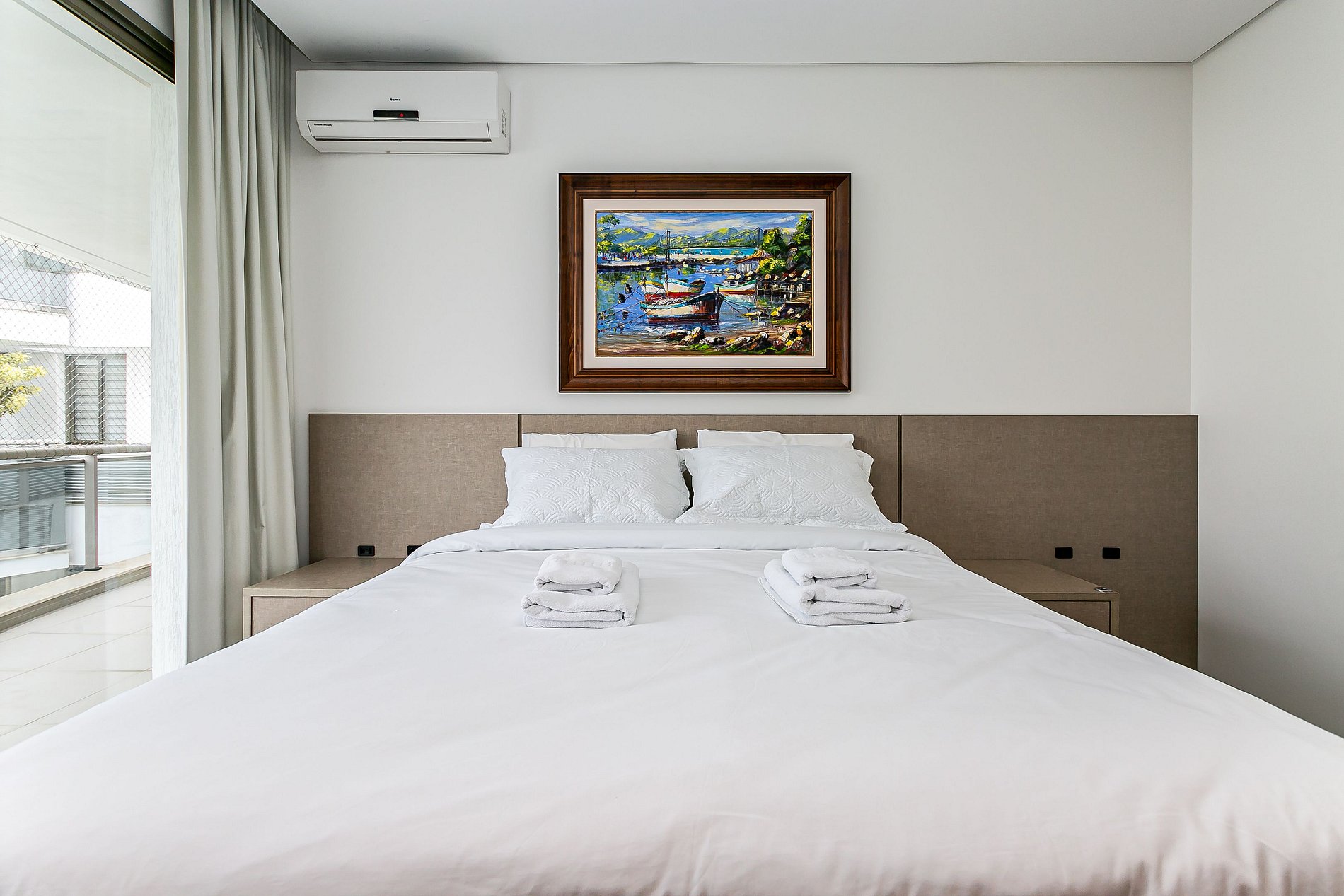 O imóvel de 184m² conta com duas suítes, um quarto e uma sala de estar com Smart TV. Todos os cômodos são equipados com Ar-condicionado SPLIT.