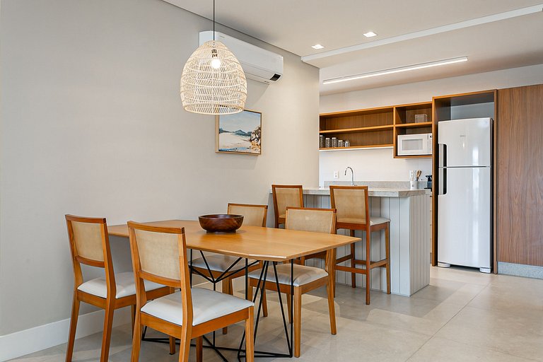O imóvel de 92,81m² conta com duas Suítes, uma sala com Smart TV e uma sacada com churrasqueira. Todos os cômodos são equipados com Ar-condicionado Split.