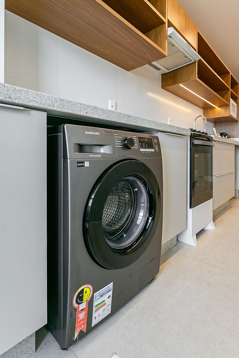 - Cozinha completa com cafeteira, geladeira com congelador, liquidificador, micro-ondas, sanduicheira, utensílios de cozinha e jogo de panelas