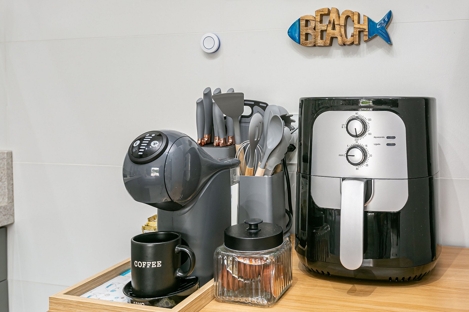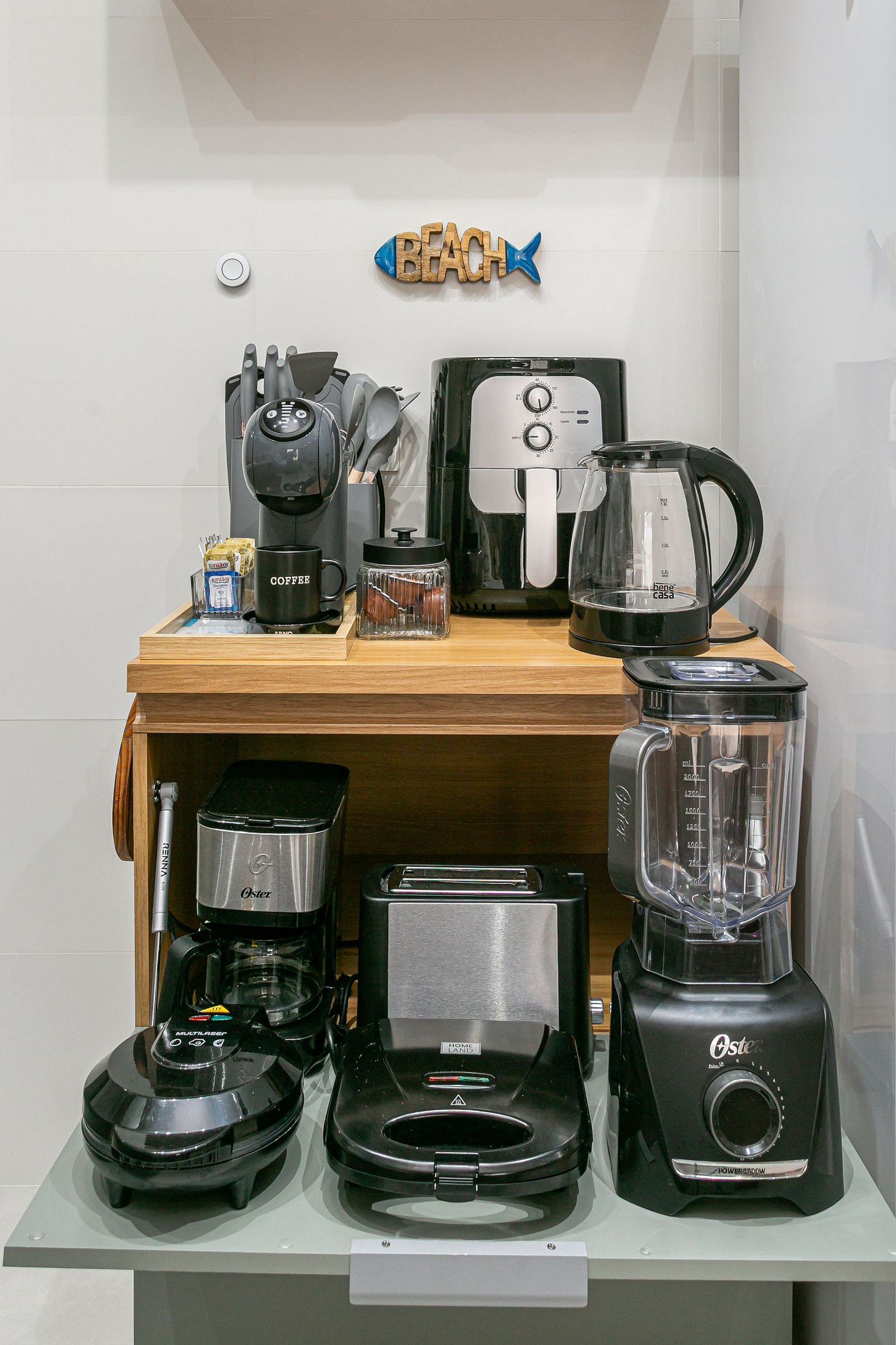 - Cozinha completa com cafeteira, chaleira elétrica com temperatura ajustável, geladeira, liquidificador, sanduicheira, utensílios de cozinha e jogo de panelas.
