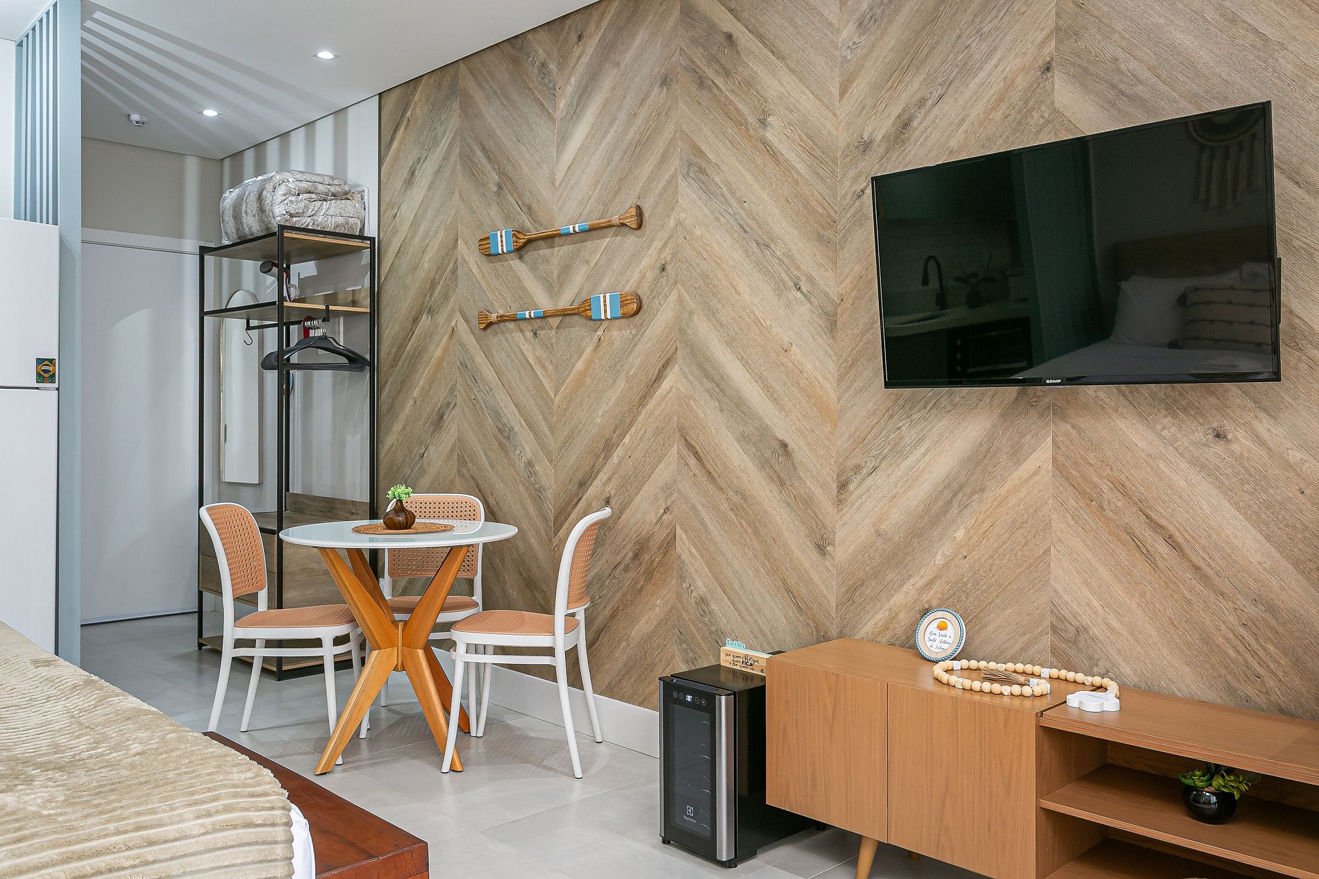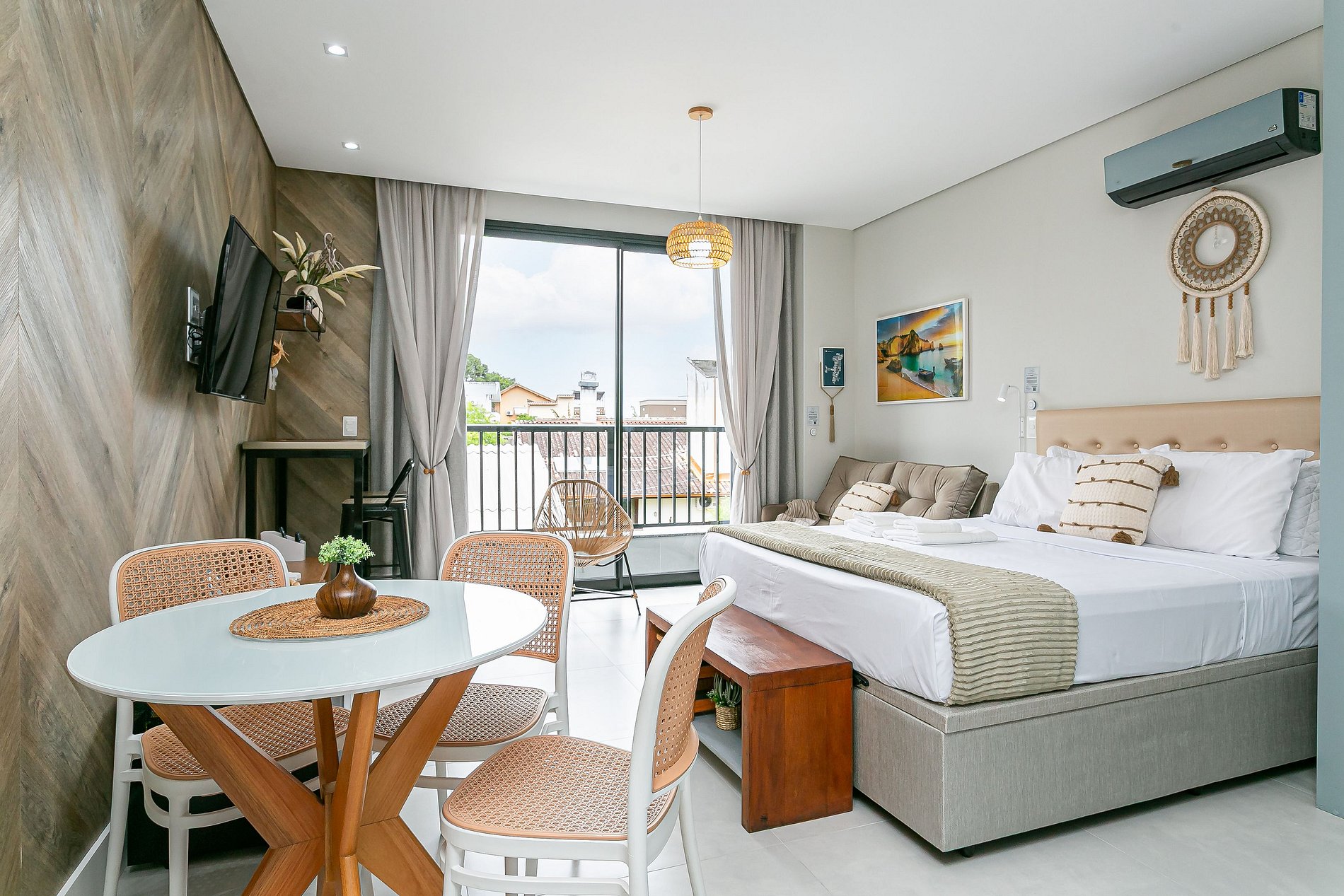 O imóvel de 34m² conta com uma CAMA QUEEN, SOFÁ CAMA CASAL SMART TV DE 43" E AC SPLIT (QUENTE E FRIO).