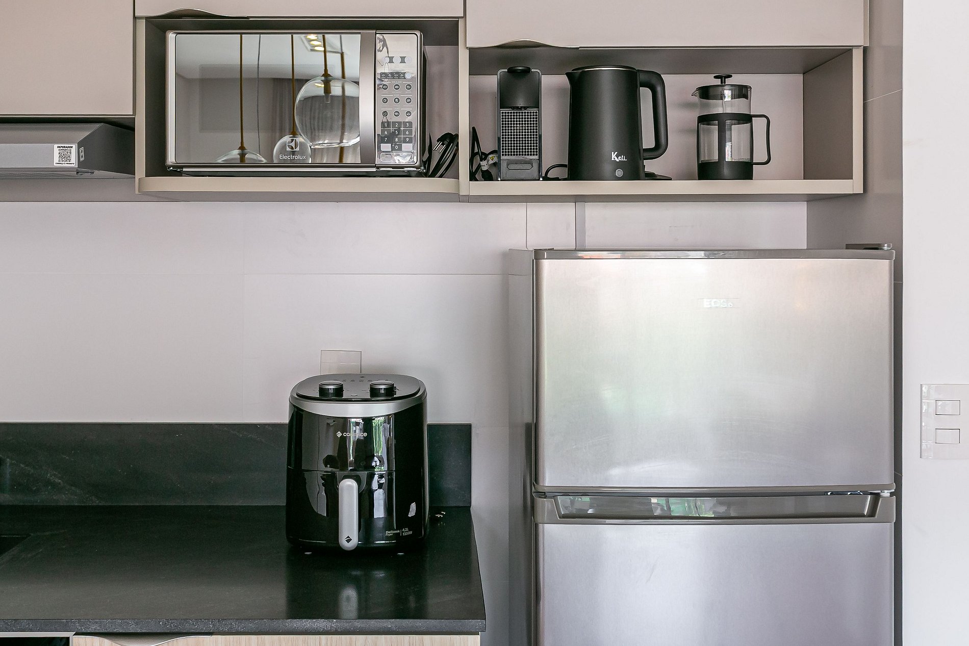 - Cozinha completa com cafeteira, geladeira, liquidificador, sanduicheira, utensílios de cozinha e jogo de panelas