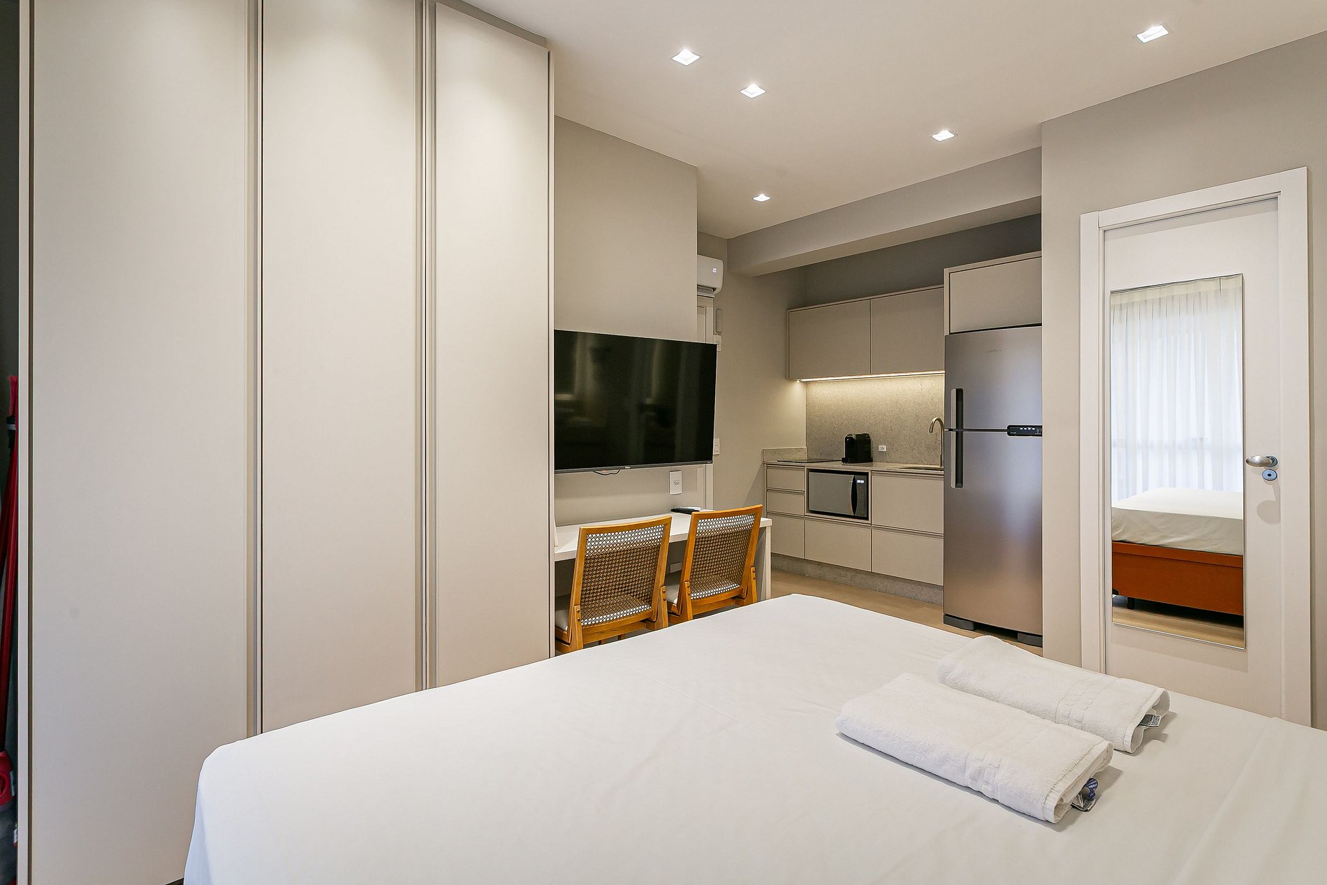 O Studio possui área de diversos tamanhos. Sendo equipado com cama CASAL, televisão SMARTV e ar-condicionado.