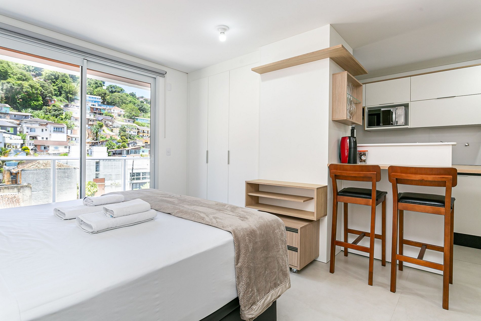 O imóvel de 39m² conta com uma CAMA QUEEN, SMART TV DE 50" E AC SPLIT.