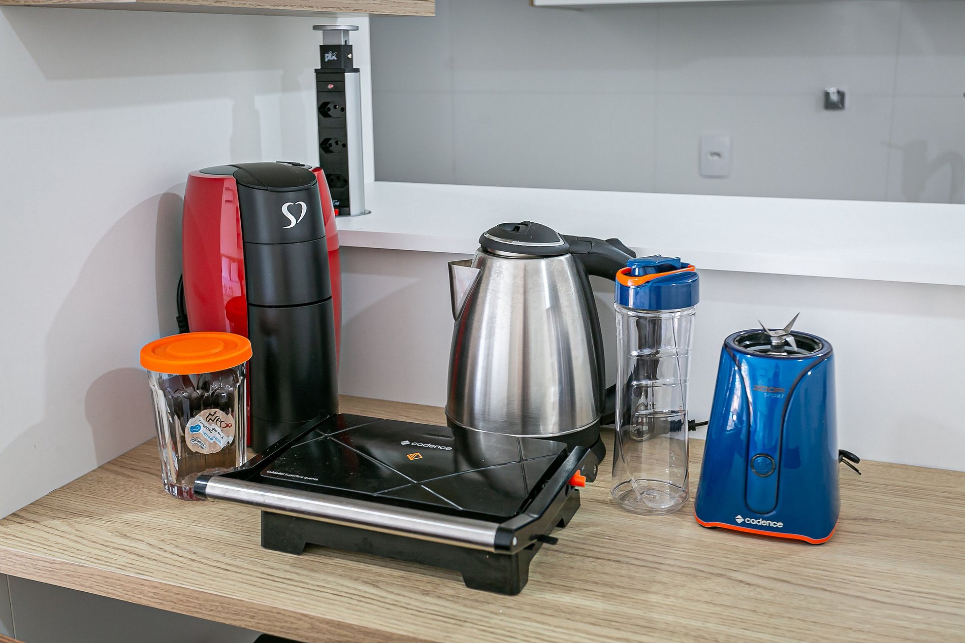 - Cozinha completa com cafeteira, geladeira com congelador, liquidificador, sanduicheira, utensílios de cozinha e jogo de panelas